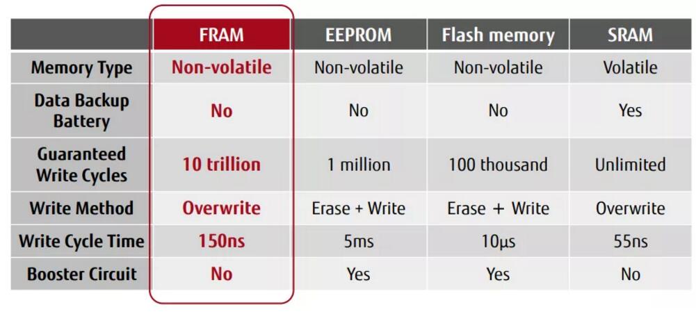 其中FRAM寫入次數(shù)壽命高達10萬億次、而EEPROM僅有百萬次(10^6)。同時,F(xiàn)RAM寫入數(shù)據(jù)可在150ns內(nèi)完成、速度約為EEPROM的1/30,000,寫入一個字節(jié)數(shù)據(jù)的功耗僅為150nJ、約為EEPROM的1/400,在電池供電應(yīng)用中具有無與倫比的優(yōu)勢。