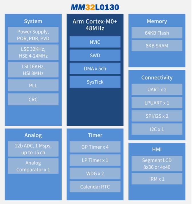 上海靈動微電子低功耗MM32L0130系列MCU產品搭載ArmCortex-M0+處理器,集成段碼LCD驅動,功耗可低至100nA,適用于多種低功耗應用場景。