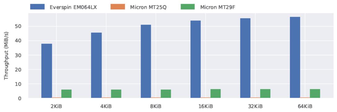 對(duì)于每個(gè)芯片,讀取/寫(xiě)入64MiB的數(shù)據(jù),從地址0開(kāi)始,到地址8388608(8MiB)結(jié)束。我們對(duì)各種訪問(wèn)大小重復(fù)該過(guò)程:2KiB、4KiB、8KiB、16KiB、32KiB和64KiB。在閃存中,每個(gè)塊在寫(xiě)入第一頁(yè)之前都會(huì)被擦除。擦除時(shí)間包括在寫(xiě)入吞吐量測(cè)量中。