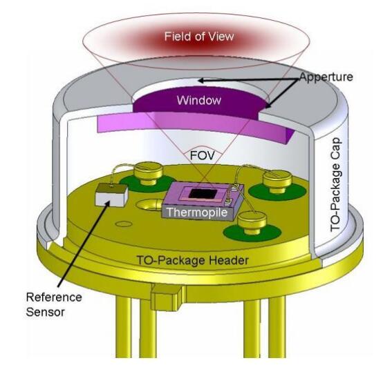 一般采用金屬外殼封裝,物料的紅外射線經過表面的濾光片進入到里面的熱電堆電偶上,再經過信號感應轉換成電信號。