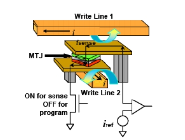 實(shí)現(xiàn)MRAM可靠存儲的一個主要障礙是高位干擾率。對目標(biāo)位進(jìn)行編程時,非目標(biāo)位中的自由層會被誤編程。目前飛思卡爾半導(dǎo)體研究人員已經(jīng)成功解決了此問題,其方法是,在每次出現(xiàn)位狀態(tài)空翻時,產(chǎn)生一個跳變位,它將磁矩的方向旋轉(zhuǎn)到同一方向。寫入線1和寫入線2上的反轉(zhuǎn)脈沖電流使極性旋轉(zhuǎn),從而不會干擾相同行或列的其它位元。