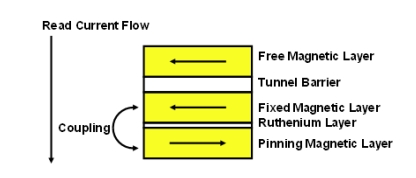 飛思卡爾半導(dǎo)體還通過增加兩個附加層來改進(jìn)固定磁性層。在固定層下面增加了一層釕(Ru)。而在Ru層下面又增加了另一層稱為牽制層(pinning layer)的磁性層。固定層和牽制層的極性相反,將會引起很強(qiáng)的耦合。該強(qiáng)耦合使固定層的極性保持鎖定,因此不會在編程操作過程中引起誤反轉(zhuǎn)(圖4)。